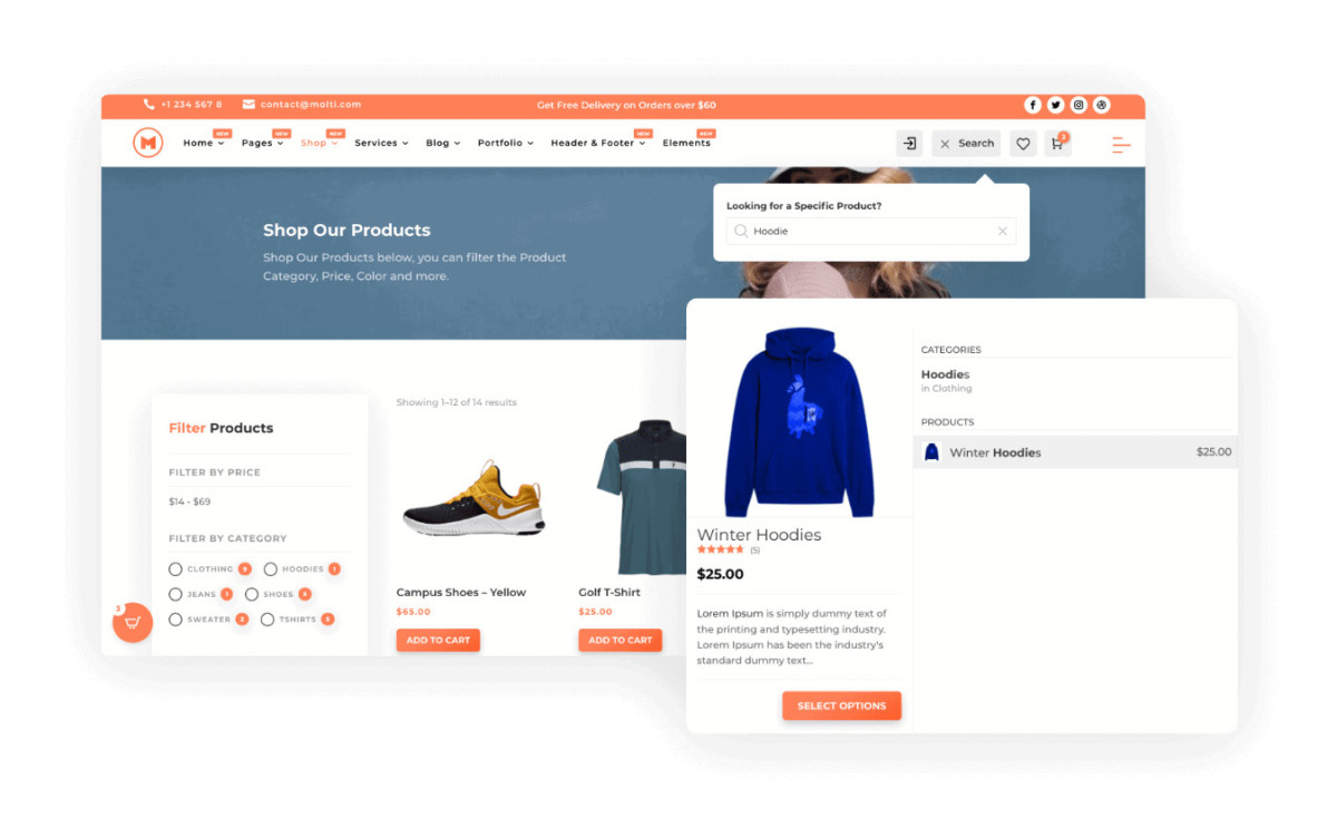 A Search Form is always required for Shop Website so that people can easily Search for what they’re looking for. So to make it easy Molti Ecommerce also provides a really nice Products Search Form that really makes it easy to Search.