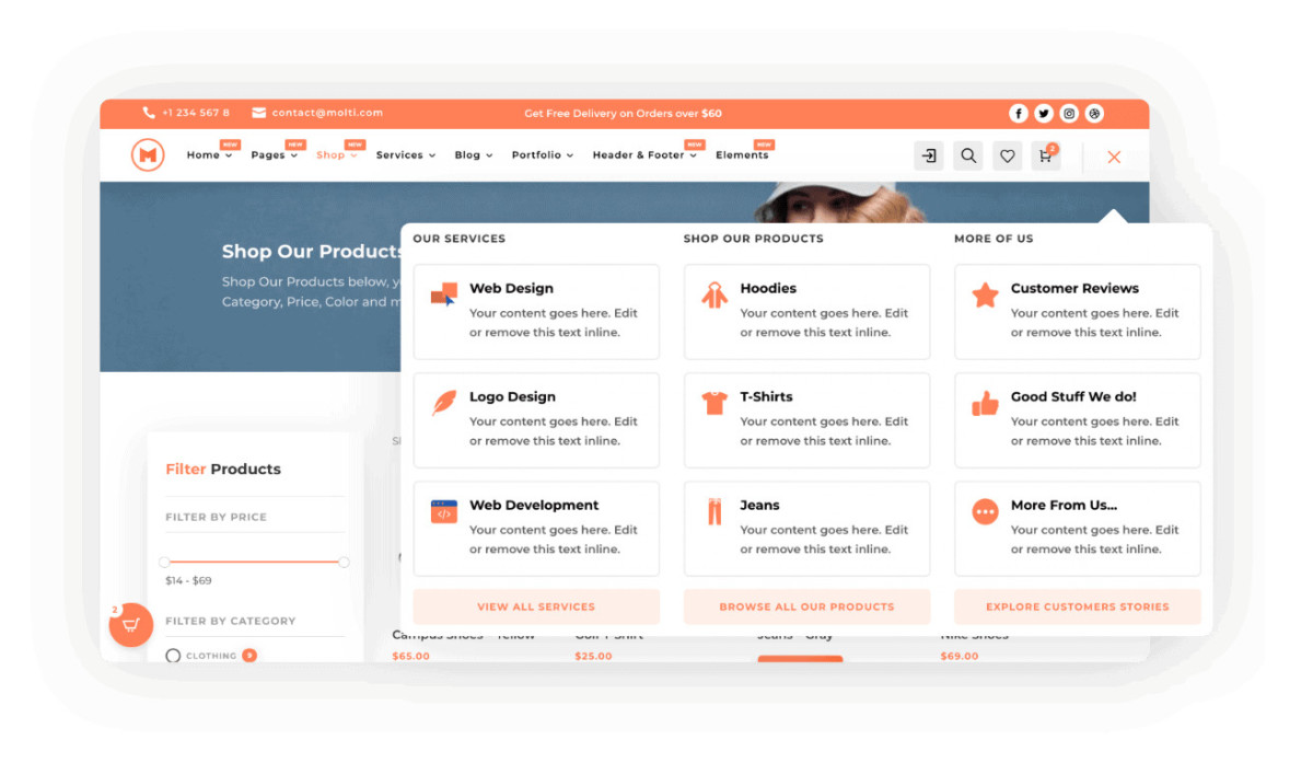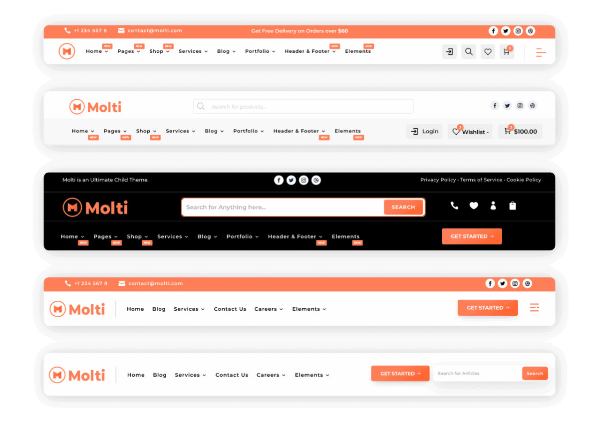With many Theme Builder Templates Molti also Provides 10 Cool Header Designs for any kind of website, simply choose a design that suits you and make it yours.