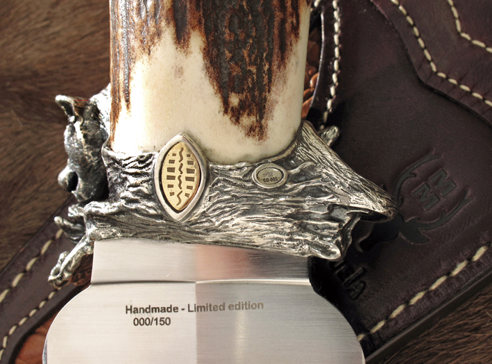 La imagen del cuchillo de remate Muela emerge desde el mango de asta y la hoja de doble filo. Edición limitada (150 unidades)