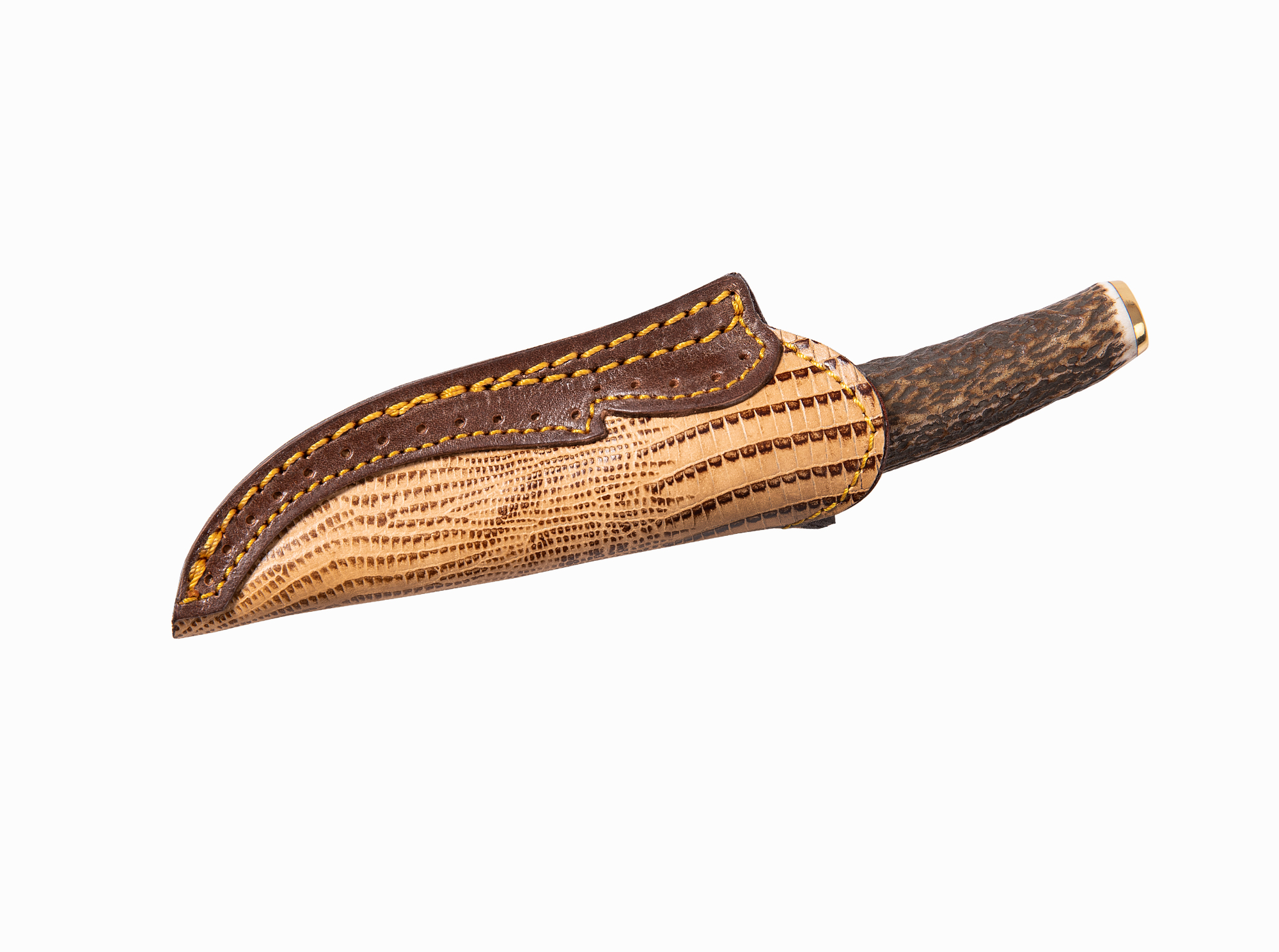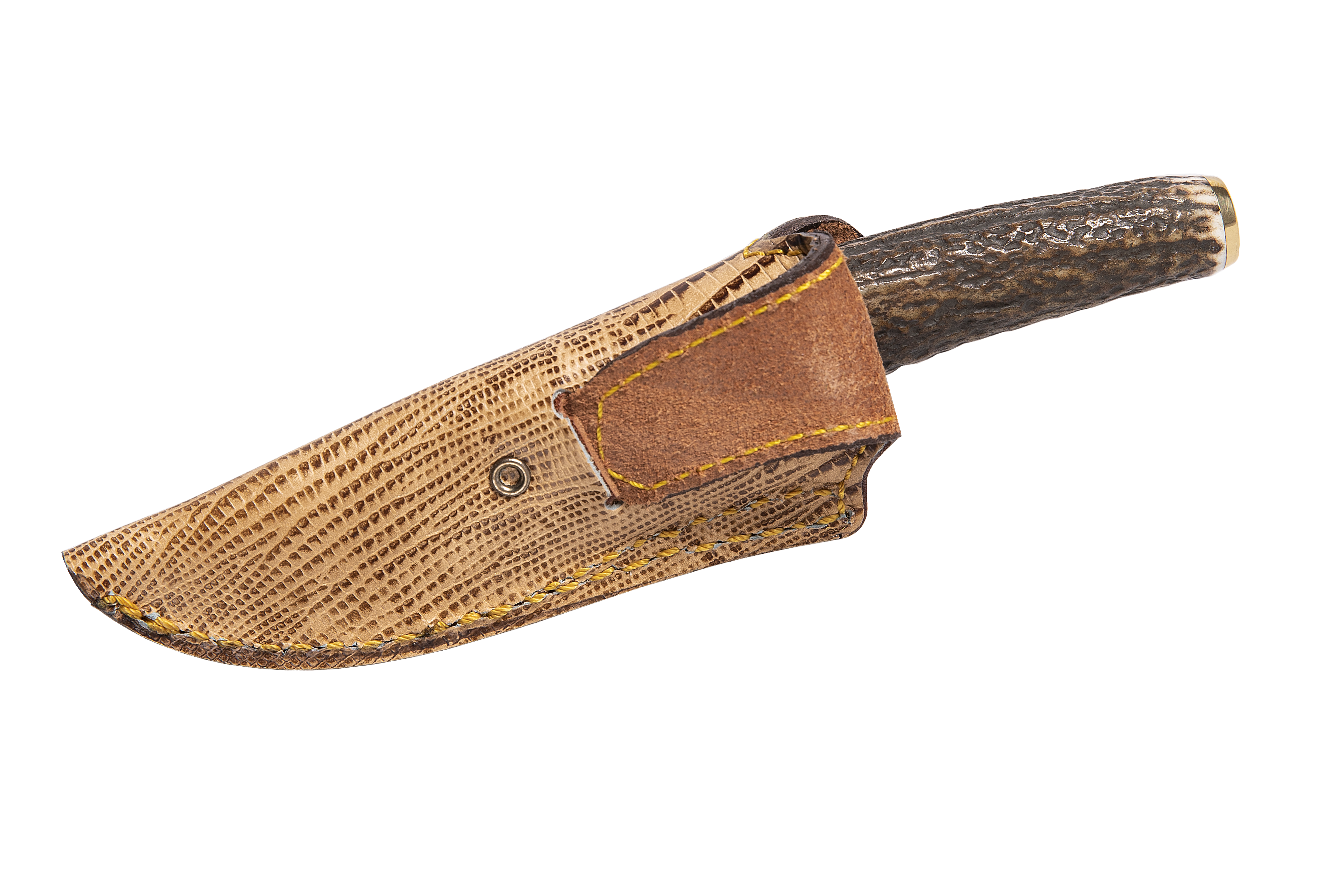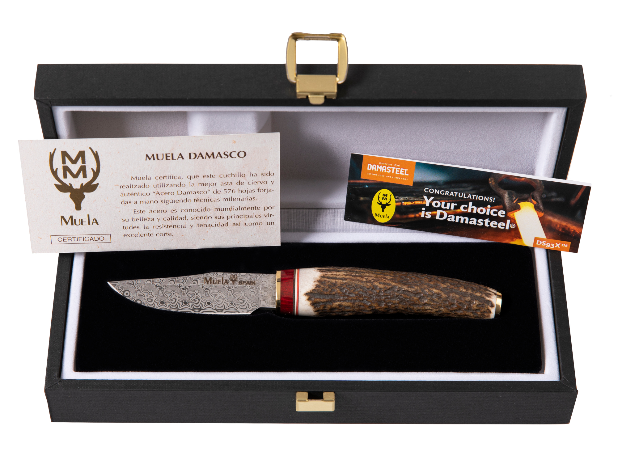 Cuchillo con hoja de acero damasco inoxidable, puño asta de ciervo y latón.
