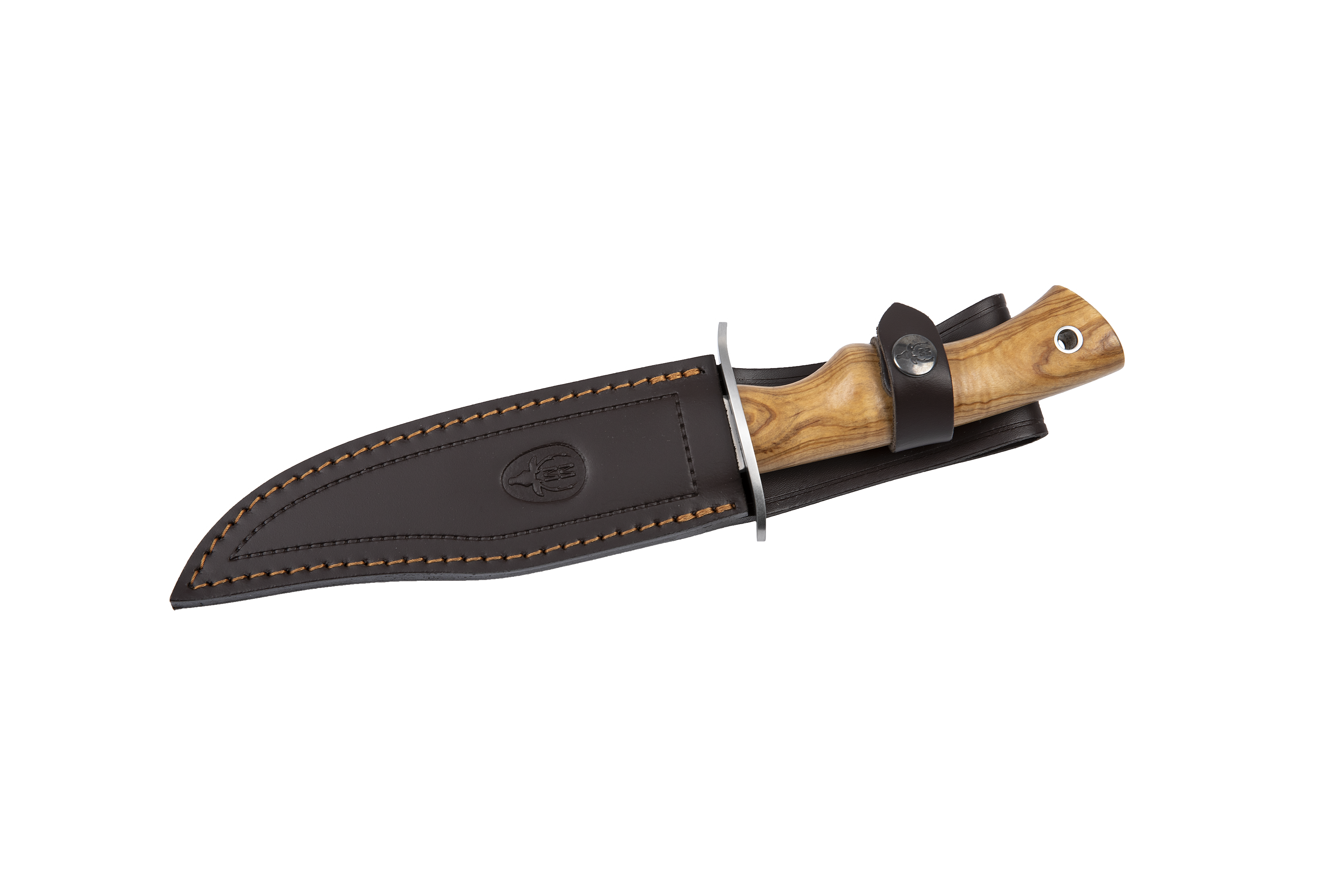 Cuchillo con mango de madera de olivo y defensa acero inoxidable.