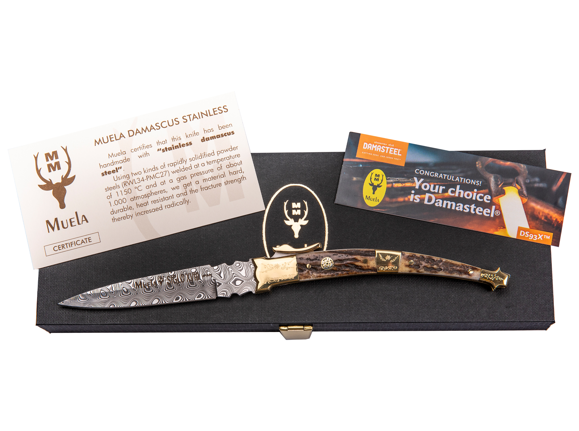 Réplica de navaja española del siglo XVIII con cachas de asta de ciervo y latón. Hoja de acero Damasco inoxidable, utilizando dos clases de acero pulvimetalúrgicos (RWL34 y PMC27) y unidos entre sí a 1150 °C y una presión de 1.00 atmósferas, se consigue un acero de una resistencia a la rotura dos veces superior así como también duplica la resistencia a la fatiga, la ductilidad y la tenacidad al impacto; además de una excepcional belleza en su grabado. Sistema de bloqueo para la hoja.