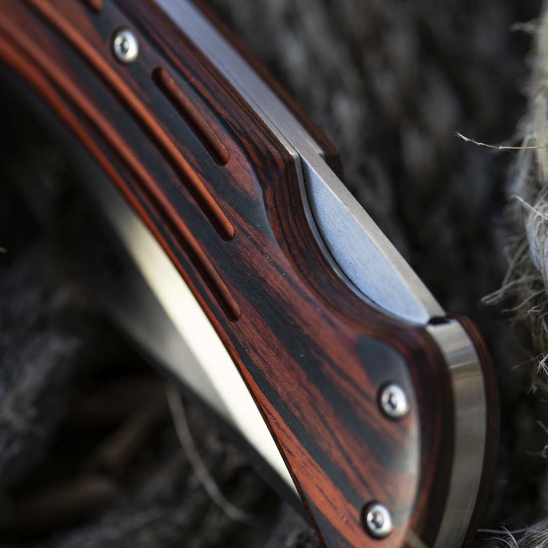 Una preciosa navaja nuestra K-9R.M. La calidez de la madera prensada coral de las cachas con su veteado, contrasta con la bella frialdad del acero MoVa de la hoja, estilo «clip point», consiguiendo transmitir la esencia del alma Muela: calidez y autenticidad, junto a precisión y resistencia.