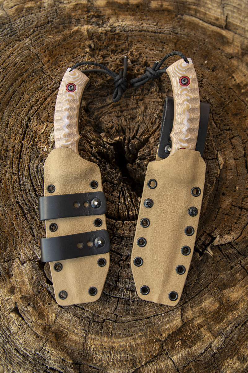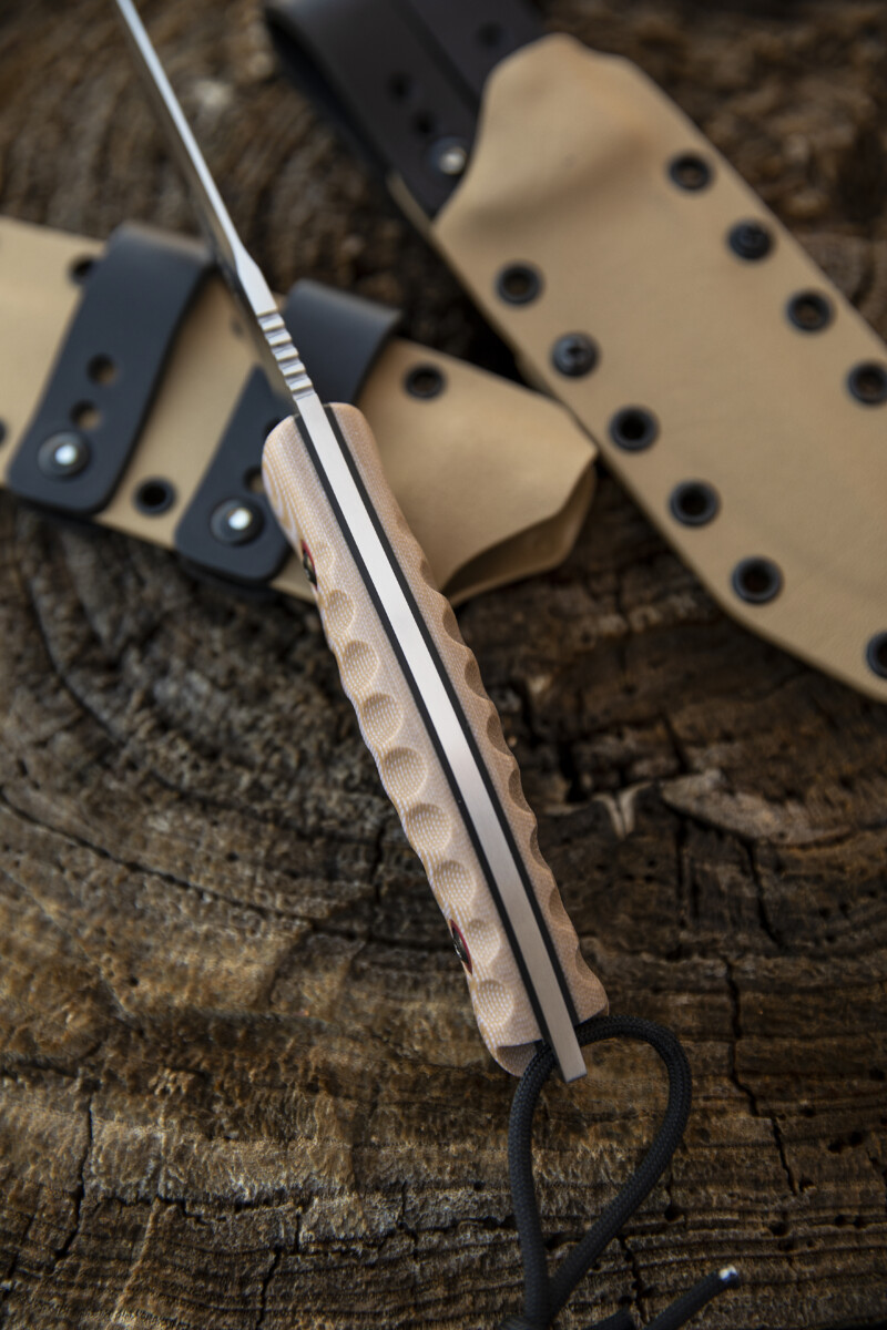 🤲 El mango, elaborado en micarta color arena, no solo aporta una estética táctica y sobria, sino que también ofrece un agarre seguro y cómodo incluso en condiciones de humedad, barro o frío. Además, la textura y el diseño ergonómico del mango favorecen un control total en cada uso.