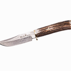 Cuchillo con puño de asta de ciervo tallado (escena jabalí) con roseta y defensa de latón e inoxidable.