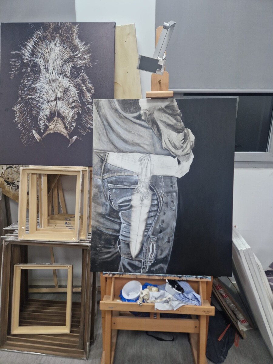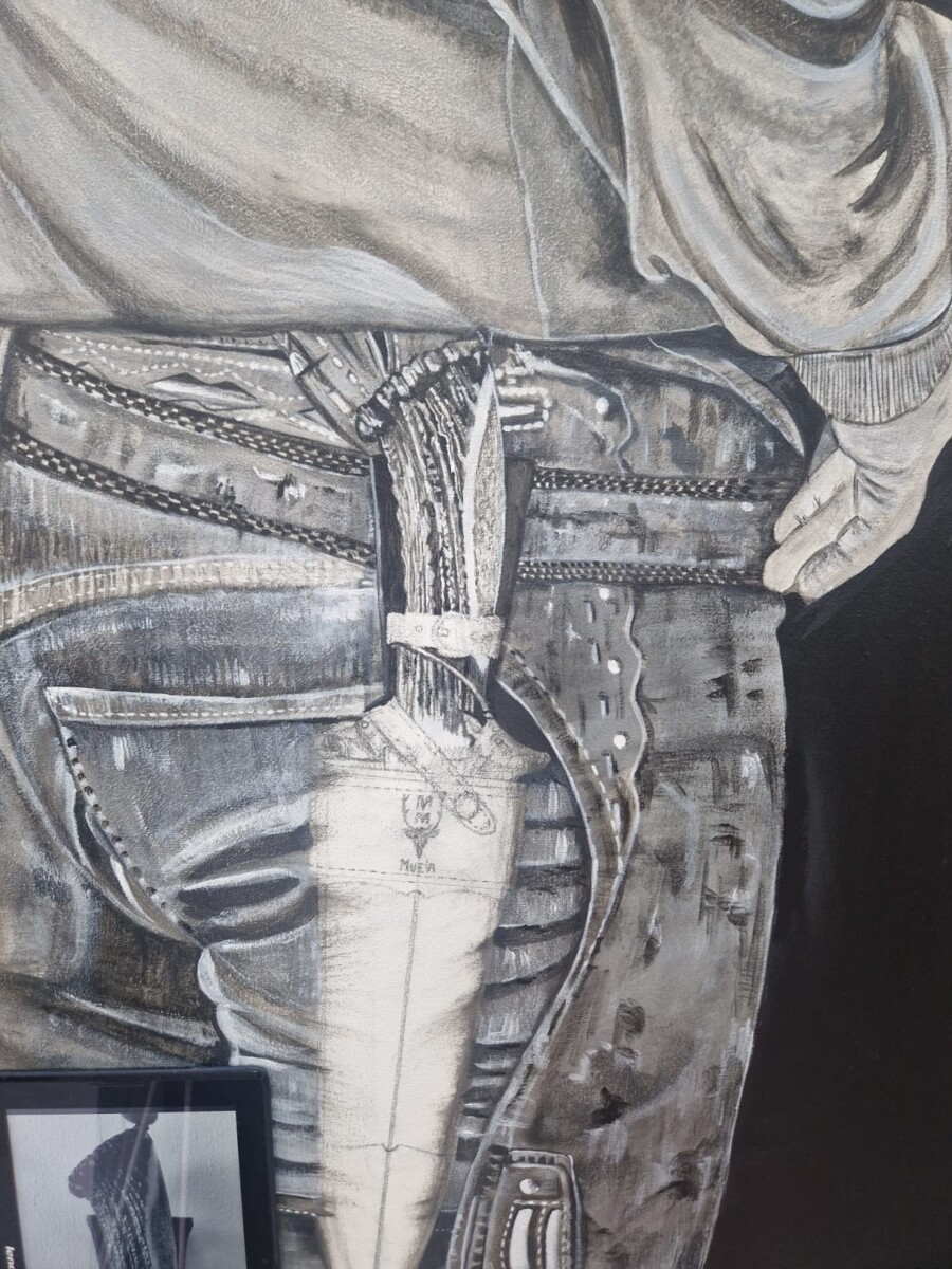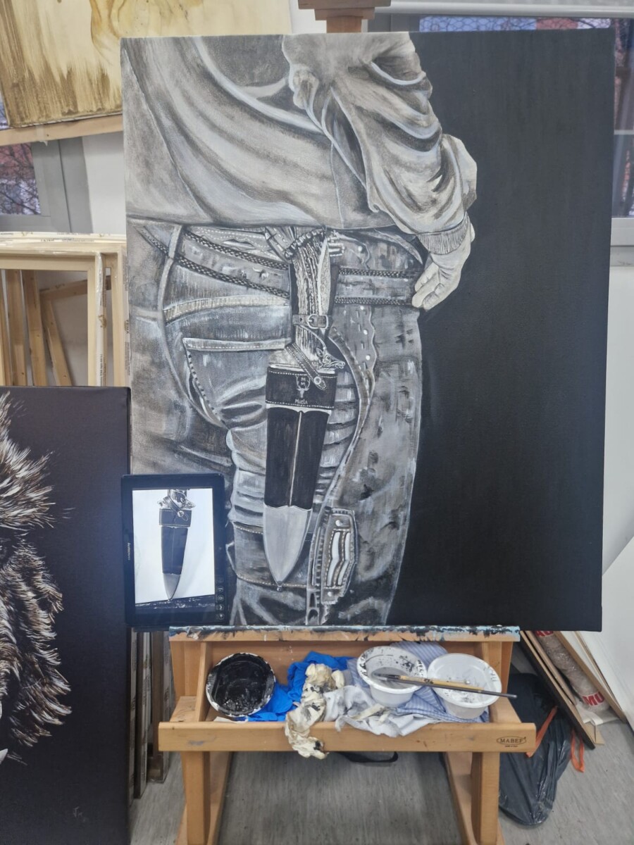 Cada detalle del lienzo transmite la destreza y el carácter de una herramienta que es mucho más que un objeto: es parte de nuestra cultura y legado. El pintor, con su estilo único, logra inmortalizar la esencia del cuchillo Mastin de Muela, una pieza que representa la tradición y la maestría de la forja.